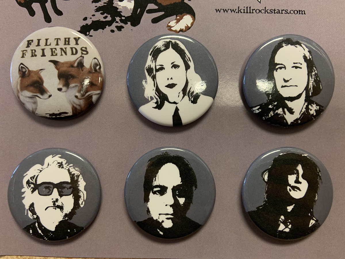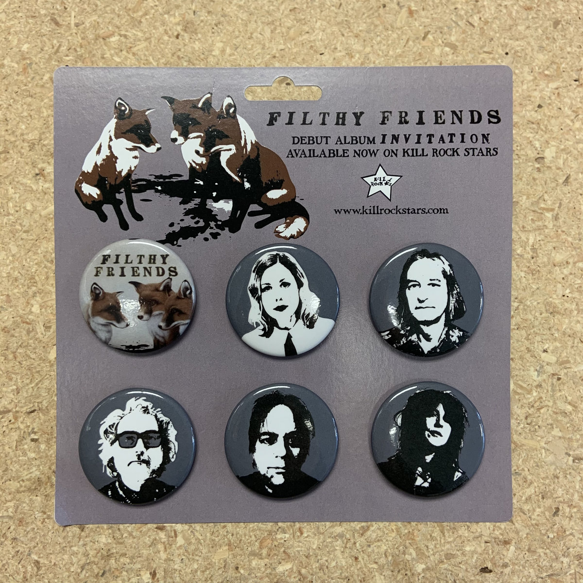 Filthy Friends Invitation album pin set. Includes 6 pins, one of each band member and then one of the album cover. About an inch or so big. They lay pretty flat.